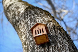 Lepkeházacska a madár-lakópark sétánynál a debreceni Nagyerdő parkerdei területén 2022. december 28-án. A Future of Debrecen zöld mozgalom keretén belül a sétányon 16 állomást alakítottak ki. Mindenhol más-más típusú madárodút helyeztek el, ahol egy oszlopon lévő madársziluett hívja fel a figyelmet, illetve egy QR-kód segítségével pedig egy rövid videófelvételt lehet megtekinteni az adott állatfajról. A madárodúk mellett lepkeházat, békalakot, rovarhotelt és süngarázst is elhelyeztek.