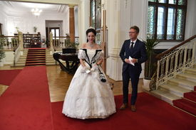 Budapest, 2025. október 9. Hankó Balázs kultúráért és innovációért felelõs miniszter (j), mellette az Erzsébet királynét megszemélyesítõ Berta Blanka a Jókai Mór mûveibõl rendezett felolvasás megnyitó eseménye elõtt a Kulturális és Innovációs Minisztériumban (KIM) 2025. október 9-én. A minisztérium szervezésében, a Jókai 200 emlékév hivatalos programsorozatának részeként október 9-én és 10-én megrendezett Jókai200 – 24 órás felolvasás elnevezésû programhoz több kulturális intézmény, partnerszervezet, háttérintézmény, iskola és Jókai Mórhoz kötõdõ ikonikus helyszín is csatlakozik.