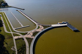 Drónnal készült felvételen a Velencei-tó korszerűsített gárdonyi hajóállomása a bejárás napján, 2023. október 16-án. Több mint 285 millió forint kormányzati támogatásból megújult a Velencei-tó öt hajókikötője.