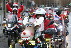 Mikulás-jelmezbe öltözött motorosok karácsonyi ajándékokat visznek hátrányos helyzetû gyerekeknek Belgrádban 2023. december 23-án