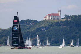 Vándor Róbert katamaránja, az RSM az 57. Kékszalag Raiffeisen Nagydíj tókerülõ vitorlásverseny rajtja elõtt Balatonfüred közelében 2025. július 10-én