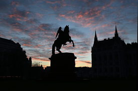 Naplementében a Rákóczi-szobor és az Országház a Kossuth Lajos téren 2025. december 26-án