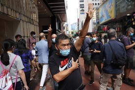 Demokráciapárti tüntetők a Kínai Népköztársaság alapításának 71. évfordulója alkalmából rendezett és a hatóságok által nem engedélyezett tiltakozáson Hongkongban 2020. október 1-jén.
