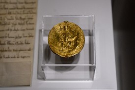 II. András királyi aranypecsétje, amelyről a 31 pontból álló Aranybulla a nevét kapta, a székesfehérvári Szent István Király Múzeumban 2022. április 24-én. II. András 800 évvel ezelőtt ezen a napon, a hagyomány szerint a székesfehérvári Csúcsos-hegyen hirdette ki az Aranybullát, a rendi állam magyar jogrendszerének legfőbb tartóoszlopává váló oklevelet