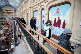 Az új koronavírus elleni oltásra várnak az emberek a moszkvai GUM áruházban létesített oltóközpont előtt 2021. január 21-én.