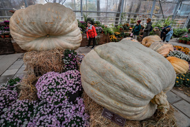 Oroszországban termesztett óriástökök kiállítása a Moszkvai Állami Egyetem Botanikus Kertjében 2021. október 15-én