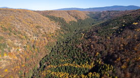 A drónnal készült képen őszi színekbe borult fák a Hargita megyei Zeteváralja közelében 2024. november 5-én