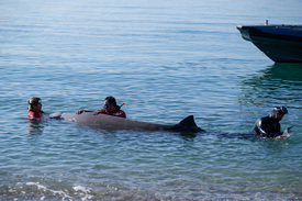 Búvárok és állatorvosok próbálnak egy partra vetődött bálnaborjút visszaterelni a tengerbe Athéntól délre 2022. január 28-án. Szakemberek szerint az állat egy Cuvier-féle csőröscet és súlyos sérülés nyomait fedezték fel rajta