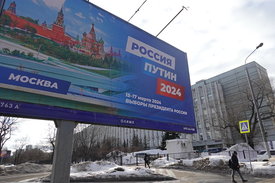 Vlagyimir Putyin orosz elnök választási plakátja Moszkvában 2024. március 11-én. Az elnökválasztást március 15-17-én tartják Oroszországban