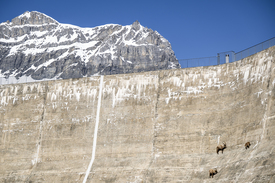 Vadon élő alpesi kőszáli kecskék (Capra ibex) sófoltokat keresnek a Salanfe víztározó betonfalán a Valais kantonbeli Salvan településnél 2025. május 16-án