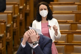 Szabó Tímea, a Párbeszéd frakcióvezetője napirend előtt szólal fel az Országgyűlés plenáris ülésén 2021. március 16-án. Az előtte ülő Zsigó Róbert fideszes képviselő a fejét fogja