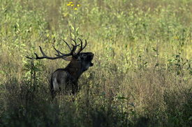 Gímszarvas bika (Cervus elaphus) a szarvasbőgés idején a SEFAG Zrt. Barcsi Erdészetének területén 2023. szeptember 20-án