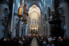 Mohos Gábor, a külföldi magyarok lelkipásztori ellátásával megbízott esztergom-budapesti segédpüspök a magyar EU-elnökség alkalmából Európáért tartott szentmisén a brüsszeli Szent Mihály- és Szent Gudula-székesegyházban 2024. július 1-jén. Magyarország július 1-től december 31-ig tölti be az Európai Unió Tanácsának soros elnöki tisztségét.