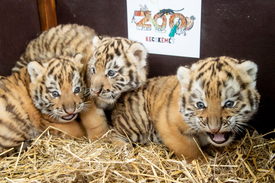 A Kecskeméti Vadaskert hathetes szibériaitigris-kölykei (Panthera tigris altaica) 2021. május 13-án.