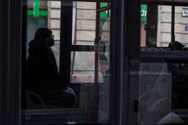 Egészségügyi maszkot viselő utas egy trolibuszon Budapesten 2021. november 1-jén. Ettől a naptól a korábban már megszokott szabályok szerint újra maszkot kell viselni a tömegközlekedési eszközökön, pályaudvarokon és megállóhelyeken