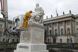 Alexander von Humboldt német természettudós (1769 – 1859) szobrát tisztítja egy munkás a berlini Humboldt Egyetem előtt 2020. július 17-én. A szobrot korábban festékbombával dobták meg