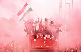 Szoboszlai Dominik, a Liverpool játékosa (k, balról) magyar zászlóval ünnepel egy nyitott tetejű buszon a bajnokcsapat felvonulásán Liverpoolban 2025. május 26-án. Az angol labdarúgó-bajnokságot a 20. alkalommal nyerte meg a Liverpool csapata.