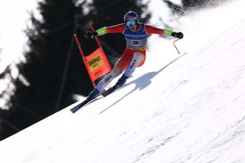 A svájci Marco Odermatt a férfiak szuperóriás-műlesikló versenyében a Saalbachban zajló alpesisí-világbajnokságon 2025. február 7-én