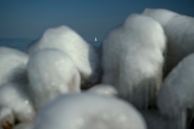 A móló hullámtörő kövein megfagyott víz, a háttérben egy vitorláshajó a balatonlellei kikötő felől fényképezve 2021. február 13-án