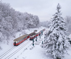 A drónfelvételen Gyermekvasúton közlekedő dízelmozdony vontatta személyvonatok a Szépjuhászné megállóban 2023. december 9-én
