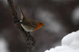 Vörösbegy (Erithacus rubecula) a téli erdőben a Pest vármegyei Csobánka környékén 2023. december 9-én