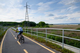 Kerékpáros Balatonszentgyörgy közelében 2023. május 10-én. A balatonrendesi összekötő szakasz elkészültével immár teljes szakaszon használható a Balatoni Bringakör. Az elmúlt években bruttó 6,1 milliárd forint értékben újult meg a 205 kilométeres kerékpárút több mint fele, elősegítve ezzel a térség szempontjából jelentős kerékpáros turizmust.