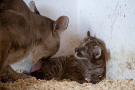 Hathetes pumakölyök anyjával, Bellával a gyöngyösi állatkertben 2022. május 27-én. A hazai állatkertek közül 2001 óta először itt született puma.
