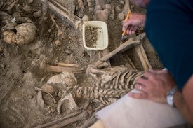 A pécsi Janus Pannonius Múzeum feltárása a Mohácsi Nemzeti Emlékhely III. számú tömegsírjánál, ahol régészek és antropológusok a tömegsír vázait emelik ki Sátorhely közelében 2020. szeptember 11-én.