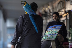 Kéksárga ara papagáj ül egy járókelő vállán Isztambulban 2025. október 8-án