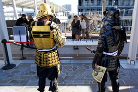 Szamurájnak öltözött elõadók a Senkyaku Banrai nevû komplexum elõtt a tokiói Tojoszu halpiac szomszédságában 2024. január 29-én. Az Edo-korszakot idézõ épületekben több mint hatvan étterem, valamint gyógyfürdõk kapnak helyet. A komplexum hivatalos megnyitója február elsején lesz, az üzemeltetõk mintegy kétmillió látogatót várnak az elsõ évben