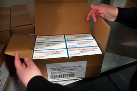 Az amerikai Moderna cég újonnan érkezett, koronavírus elleni vakcinái a Budapest Főváros Kormányhivatala Népegészségügyi Főosztályának épületében 2021. február 2-án