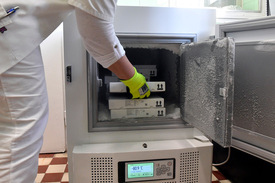 Palotás Mónika főgyógyszerész speciális hűtőszekrénybe teszi a koronavírus elleni oltóanyagot, az újonnan érkezett Pfizer-BioNTech-vakcinákat az Észak-Közép-budai Centrum (ÉKC) Új Szent János Kórházban, a főváros XII. kerületében 2021. január 26-án