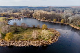 A drónnal készült képen a Vekeri-tó Debrecen közelében 2023. január 30-án. Az elmúlt időszak csapadékos időjárásának következtében újra van víz a tavaly nyáron az aszály miatt teljesen kiszáradt tóban.