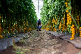 Paradicsomültetvényen dolgozik egy férfi az olaszországi Fondiban 2020. június 5-én, miután a koronavírus-járvány miatt elrendelt korlátozások enyhítéseként újraindulhat a paradicsomfeldolgozás az országban