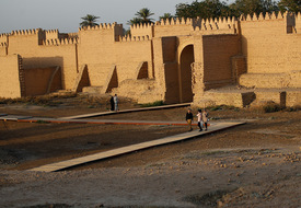 Látogatók sétálnak Babilonban, az Irak középső részén elterülő, újranyitott ókori városban 2021. március 21-én. Az UNESCO világörökségi bizottsága 2019. július 5-én a kulturális világörökség részévé nyilvánította Babilont