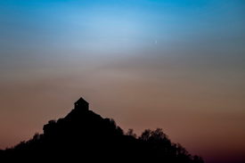 A C/2024 G3 ATLAS jelölésû üstökös (jobbról) látszik a salgói vár mellett Salgótarján közelébõl fotózva 2025. január 14-én napnyugta után