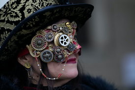 Jelmezes résztvevő a velencei karnevál nyitónapján, 2024. január 27-én. Az idén február 13-ig tartó karnevál a város szülöttje, Marco Polo világutazó kereskedő, felfedező halála hétszázadik évfordulójáról emlékezik meg
