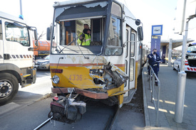 Ütközésben megsérült villamos Budapest IX. kerületében, a Könyves Kálmán körút és a Gyáli út kereszteződésénél 2021. március 8-án. A villamos egy teherautóval ütközött össze. A balesetben az elsődleges információk alapján senki nem sérült meg