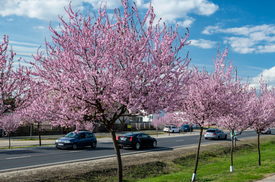 Virágzó cseresznyeszilvafák, más néven mirabolán fák (Prunus cerasifera) Bocskaikertben a 4-es számú főútvonal mentén 2022. április 10-én