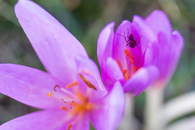 Vöröshangya egy virágzó őszi kikericsen (Colchicum autumnale) a Zala megyei Pölöske közelében 2022. szeptember 20-án