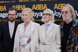 Björn Ulvaeus, Agentha Fältskog, Anni-Frid Lyngstad és Benny Andersson (b-j), a svéd ABBA együttes tagjai az ABBA Voyage című virtuális show bemutatóján a londoni ABBA Arénában 2022. május 26-án. A koncerten nem a zenekar tagjai, hanem az 1979-es külsejük alapján készített digitális avatarjaik lépnek fel egy tíztagú zenekarral. Az ABBA együttes negyven évvel The Visitors című albuma után készítette el Voyage című lemezét. Az 1972-ben alapított és 1982-ben feloszlott zenekar a hetvenes évek egyik legnépszerűbb popformációja volt, világszerte több mint 400 millió lemezt adtak el