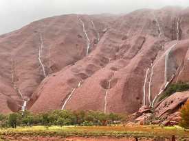 2021. március 21-én készült kép az elmúlt napok heves esőzései nyomán kialakult látványos vízesésekről az ausztrál Uluru homokkősziklatömbön. Az UNESCO világörökségi listáján szereplő Uluru-szikla, amelyet korábban Ayers-sziklaként is emlegettek, 348 méterre magasodik ki a sivatagi környezetből Ausztrália Északi területén, Alice Springs közelében.