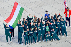 A magyar csapat az Európa Játékok záróünnepségén Krakkóban, a Henryk Reyman Városi Stadionban 2023. július 2-án