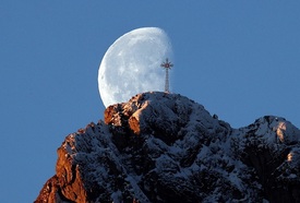 Lemegy a Hold a Nagy-Giewont 1895 méter magas csúcsa mögött a Magas-Tátrában a dél-lengyelországi Zakopanéban 2022. március 23-án