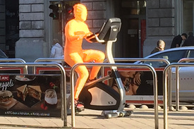 A narancssárga figurának üzennénk: a testmozgás valóban fontos, de máskor inkább egy csendesebb parkban szobabicklizzen, mert a Nagykörúton elég rossz a levegő a reggeli csúcs idején.