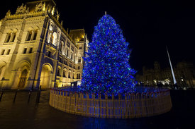 Befejeződött az ország karácsonyfájának feldíszítése. A 23 méter magas, 50 centiméter törzsvastagságú ezüstfenyőt 33600 színes izzó ékesíti, szánkókból formázott kordon veszi körül.