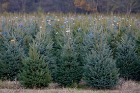 Színes szalagokkal megjelölt, karácsonyfának szánt fenyőfák Somogy megyében, egy csurgónagymartoni ültetvényen 2021. november 13-án