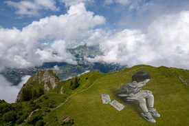 A Saype mûvésznéven ismert Guillaume Legros francia-svájci tájmûvész Le soleil a rendez-vous avec la lune (A Nap és a Hold találkozása) címû két földfestményének egyike az alpesi Villars-sur-Ollon síparadicsom közelében 2023. július 14-én.