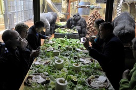 A különleges reggelit az Emberszabású majmok házában tartották: a reggelizőasztal üvegfalon kívüli végénél ismert személyiségek és szakértők, a védőüvegen belüli oldalán pedig az itt élő hegyigorilla-család tagjai fogyaszthatták a zöldségekből álló menüt.
