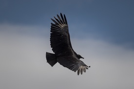 Hollókeselyű (Coragyps atratus) vitorlázik a Karib-tenger felett a venezuelai Catia La Mar kikötővárosnál 2023. augusztus 10-én. A nagytestű madár az amerikai kontinenseken honos hét keselyűfaj egyike, szárnyfesztávolsága megközelíti a másfél métert